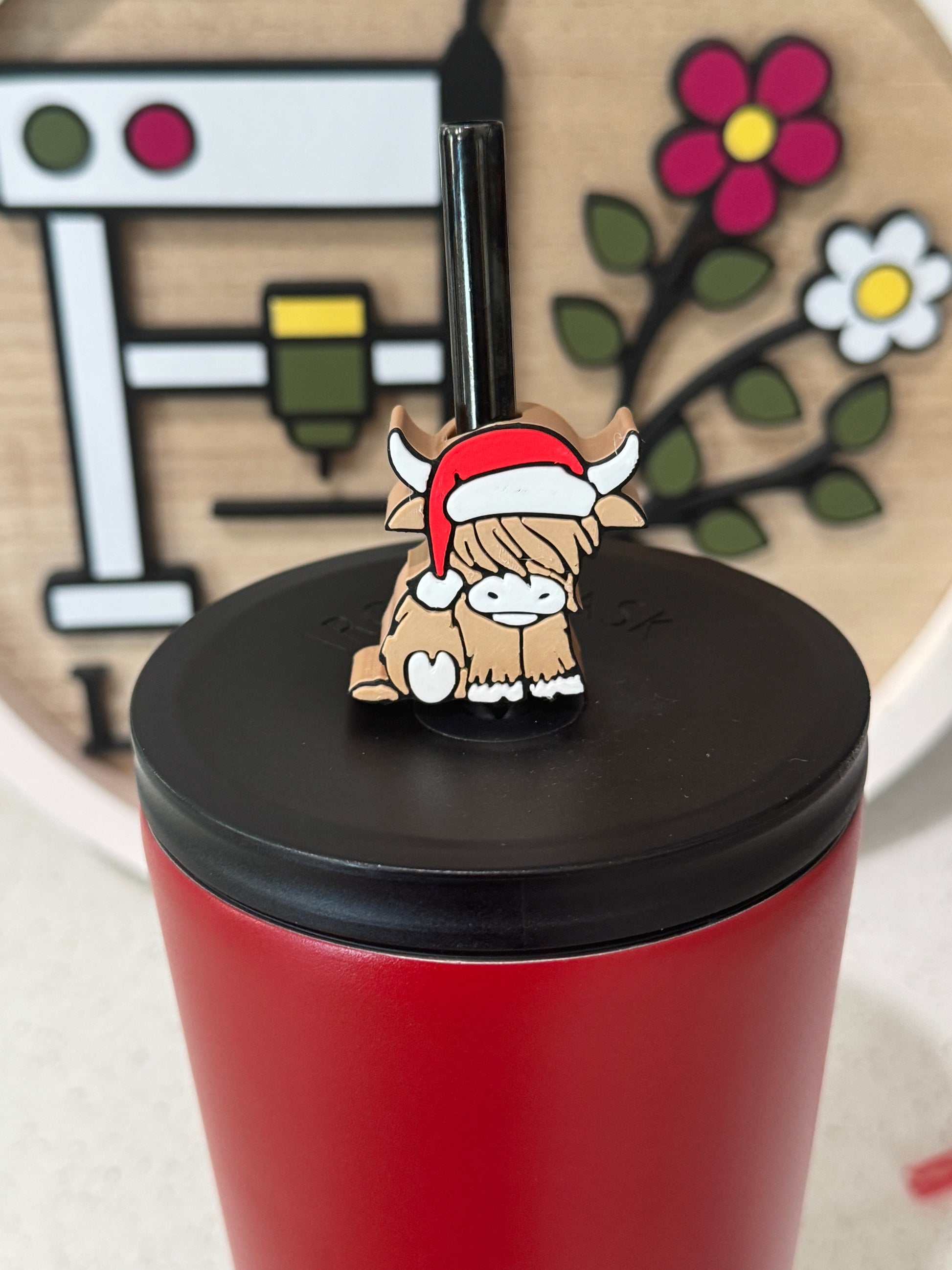 Adorable 3D printed Highland cow straw charm with a Santa hat! Fits 10 mm straws (Stanley size) and adds the cutest festive flair to your holiday drinks.