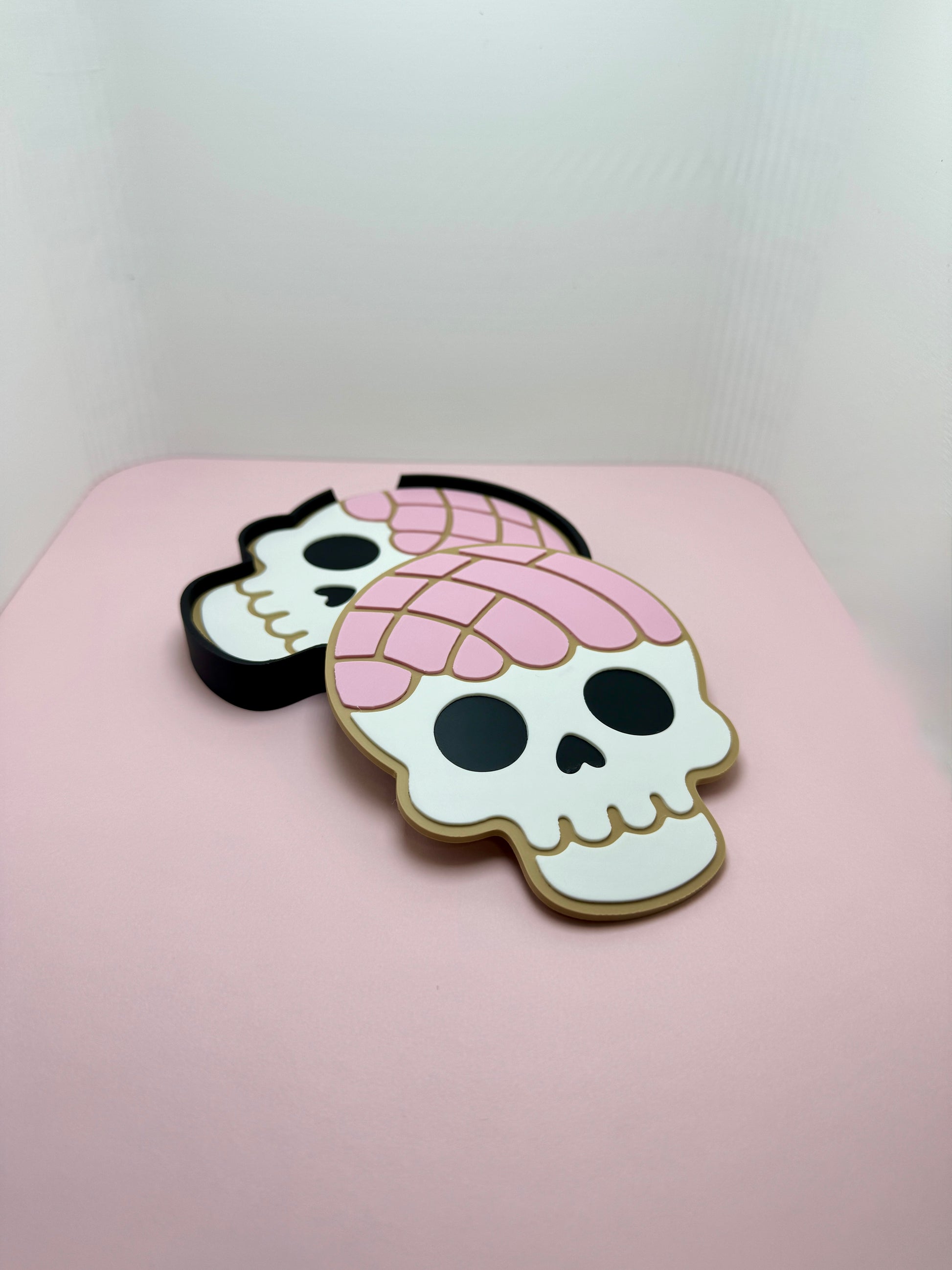 Set of 4 Concha Skull Coasters – 3D printed from durable PLA and finished with a natural cork backing to keep your drinks steady and surfaces safe. Each coaster combines the charm of pan dulce-inspired concha patterns with a playful skull design, making them a fun, functional accent for any space.